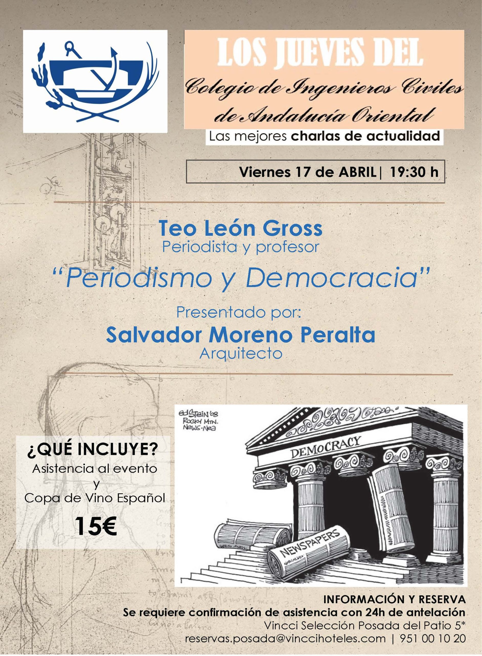 El presente 17 de abril de 2026 se trata de  «Los Jueves del CITOP de Andalucía Oriental – Teo León Gross, Periodista y profesor, «Periodismo y Democracia», presentado por Salvador Moreno Peralta, Arquitecto.